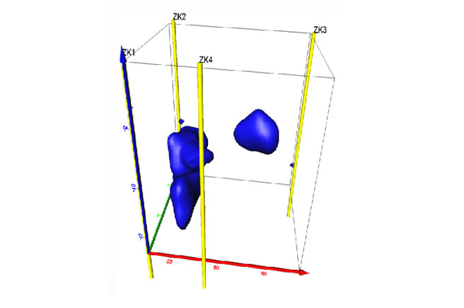 為查明杭州至富陽地鐵某區(qū)段范圍內(nèi)巖溶發(fā)育情況,采用三維電法CT技術(shù)進(jìn)行探查,獲取地下電阻率等值面立體結(jié)果,并進(jìn)行水平切片獲取二維電阻率結(jié)果,從而對溶洞等不良地質(zhì)體進(jìn)行解釋,圖中低阻區(qū)域?yàn)槌涮钚腿芏窗l(fā)育區(qū)。