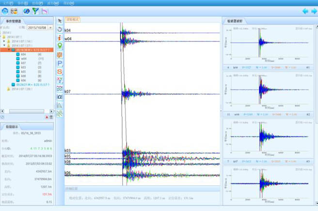 系統(tǒng)會展示實(shí)時(shí)波形、設(shè)備對應(yīng)的拓?fù)鋱D、數(shù)字采集儀及傳感器的信息以及設(shè)備管理,參數(shù)配置的相關(guān)信息,監(jiān)測到的數(shù)據(jù)實(shí)時(shí)寫入數(shù)據(jù)庫。微地震實(shí)時(shí)監(jiān)控軟件采集到數(shù)據(jù)后,用戶可以用微地震數(shù)據(jù)處理軟件和微地震三維可視化軟件分別處理和展示采集到的實(shí)時(shí)微地震數(shù)據(jù)。智能化、人工精細(xì)快速處理微震數(shù)據(jù),通過對微震數(shù)據(jù)的進(jìn)行濾波,并進(jìn)行波形變換,拾取其P、S波初至,然后定位計(jì)算得到微震事件的定位信息和震源信息。