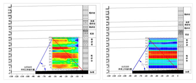 如圖所示,縱坐標(biāo)代表探測區(qū)域距離巷道頂板的垂直高度,單位為米,橫坐標(biāo)代表觀測時(shí)間;藍(lán)色基調(diào)代表低電阻率值,紅色基調(diào)代表高電阻率值。利用所得出的縮放比0.32將探測距離縮小后得到真實(shí)的超前探測視電阻率圖,在圖中能夠明顯的觀測到11月14日出現(xiàn)的彎曲下沉現(xiàn)象,并在64m~66m處,視電阻率值有明顯的上升,推測該高度出現(xiàn)真空離層,為下伏巖層彎曲下沉所致。同樣在11月14日觀測到52m~58m范圍內(nèi),視電阻率值開始升高,推斷為導(dǎo)水裂隙帶開始發(fā)育,導(dǎo)水裂隙帶發(fā)育最高高度為58m~59m。