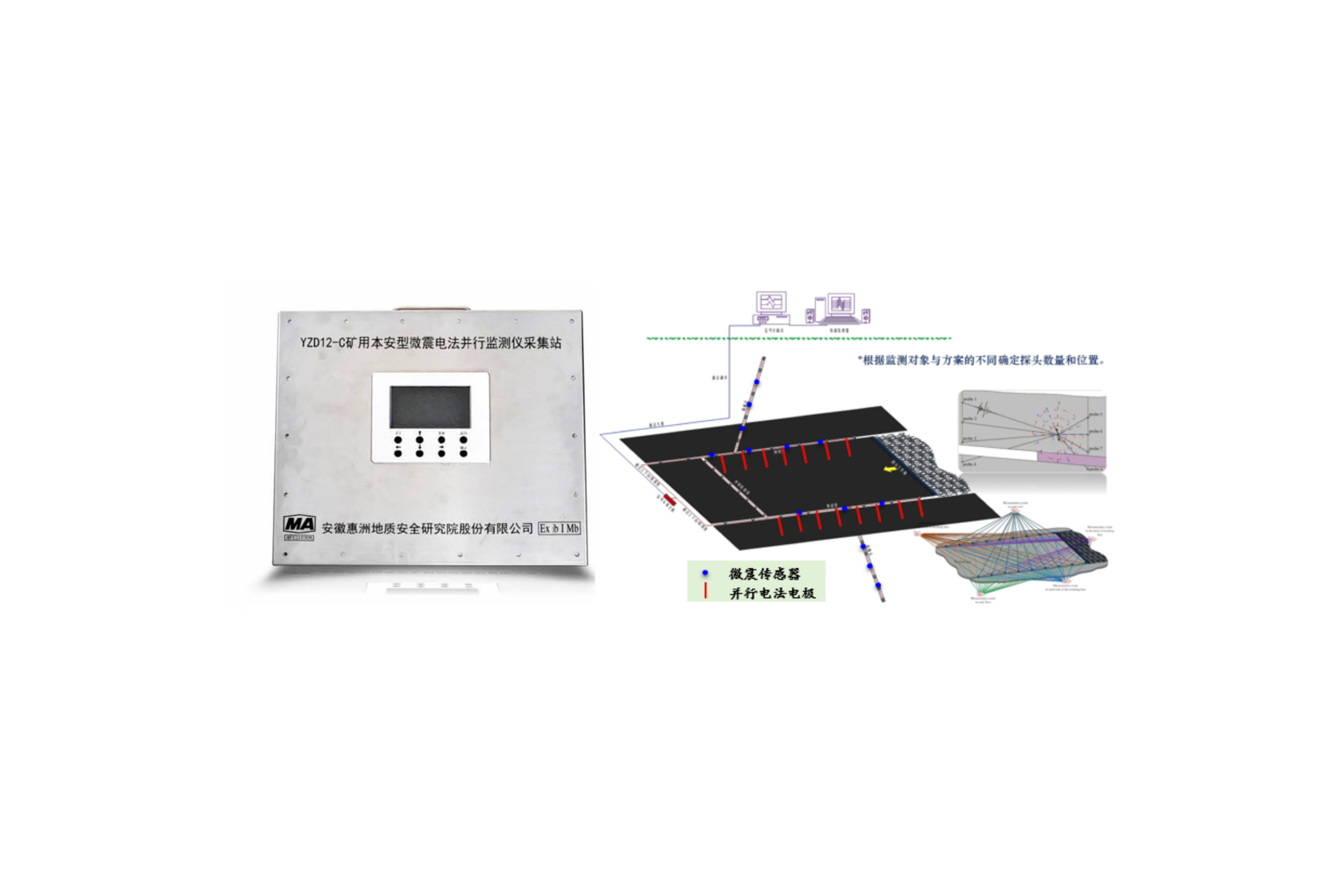 整個(gè)硬件系統(tǒng)主要儀器設(shè)備為YZD12-C礦用本安型微震電法并行監(jiān)測儀,是基于“分布式并行智能電極電位差信號采集方法” 和“一種基于礦井物聯(lián)網(wǎng)技術(shù)的物探儀器遠(yuǎn)程控制系統(tǒng)及其控制方法”等9項(xiàng)發(fā)明專利研制而成,符合《煤礦并行電法數(shù)據(jù)采集方法》等多項(xiàng)行業(yè)標(biāo)準(zhǔn)。該設(shè)備適用于《煤礦防治水細(xì)則》第九條中得微震與電法耦合監(jiān)測系統(tǒng)。微震采集模塊利用地震學(xué)、聲學(xué)和地球物理學(xué)原理和計(jì)算機(jī)強(qiáng)大的計(jì)算功能來實(shí)現(xiàn)微震事件的精確定位和級別大小的確定;電法模塊使用全電場觀測技術(shù)同步采集所有測點(diǎn)的自然電場、一次電場電位和二次電場電位數(shù)據(jù),極大提高了電法數(shù)據(jù)采集效率和采集精度。儀器為安徽省首套一體化裝備,可廣泛應(yīng)用于礦井構(gòu)造、陷落柱、水害探測和微震、微震與電法耦合等科學(xué)有效的監(jiān)測及建立突水監(jiān)測預(yù)警系統(tǒng)。