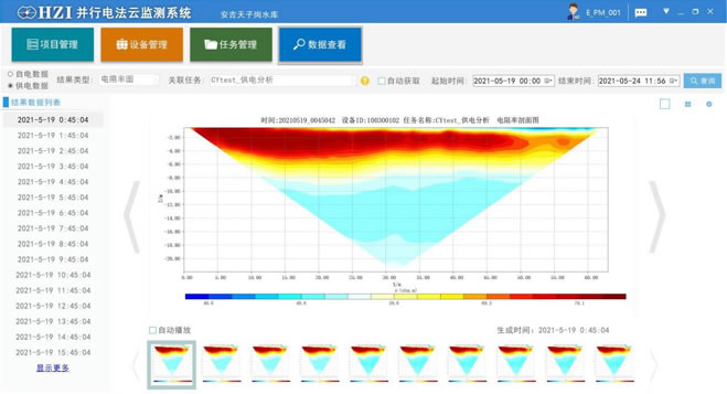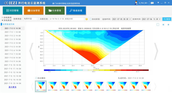 監(jiān)測(cè)系統(tǒng)硬件采用模塊集成的數(shù)據(jù)采集機(jī)箱及傳感器線纜組成。現(xiàn)場(chǎng)安裝方便,只需將線纜埋入工程巖土體表面或內(nèi)部并連接采集機(jī)箱,數(shù)據(jù)采用4G/5G模塊或者光纖進(jìn)行傳輸。系統(tǒng)根據(jù)軟件設(shè)定的參數(shù)進(jìn)行數(shù)據(jù)采集,采集的電性參數(shù)豐富,數(shù)據(jù)自動(dòng)上傳云端進(jìn)行自動(dòng)化處理,并對(duì)處理結(jié)果進(jìn)行計(jì)算比對(duì)成圖,在數(shù)據(jù)異常時(shí)及時(shí)報(bào)警。