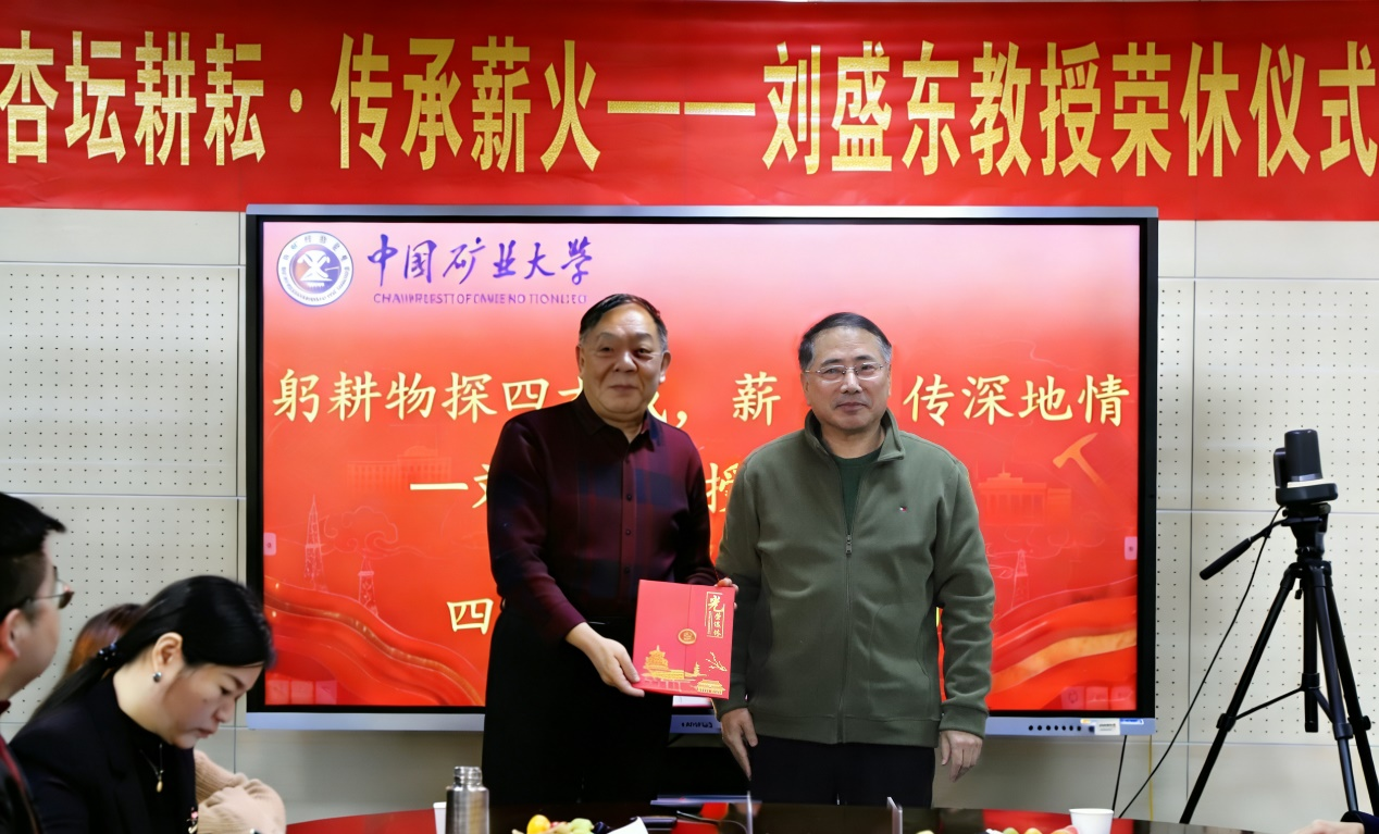 隨后,深地空間探測開發(fā)團隊秘書趙鵬副教授向劉盛東教授贈送了榮休紀念品,學生代表劉靜、楊彩及黃蘭英副教授敬獻鮮花,現(xiàn)場溫情涌動,師道傳承之情令人動容。